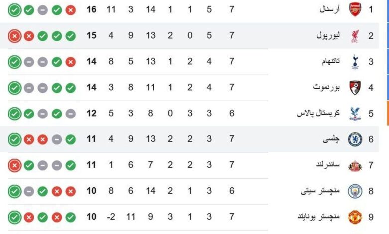 صدرنشینی آرسنال: آرسنال با پیروزی ۲-۰ مقابل وستهم، به صدر جدول لیگ برتر رسید و با ۱۶ امتیاز در جایگاه اول قرار گرفت.