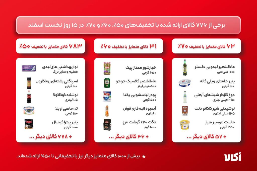 در بازه ۱۵ روزه «بزرگترین حراج آنلاین سوپرمارکتی» بیش از ۱۲۰۰ برند مطرح FMCG ایرانی و بینالمللی توانستند در پلتفرم اُکالا، ۱۱ میلیون و ۹۰۰ هزار کالا را به فروش برسانند. محصولات متمایز بسیاری با تخفیفهایی از ۱۰ درصد تا ۷۰ درصد در «بزرگترین حراج آنلاین سوپرمارکتی» ارائه شدند. در میان تمام تخفیفها، ۷۷۶ محصول با تخفیفهای از ۵۰ تا ۷۰ درصد ارائه شدند.