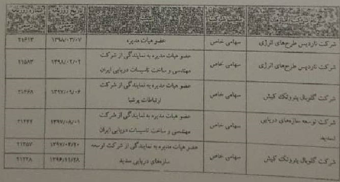 در همان ایام نامبرده به نمایندگی از شرکت توسعه سازههای دریایی تسدید در شرکت دیگری به نام شرکت گلوبال پتروتک کیش حضور یافته است.