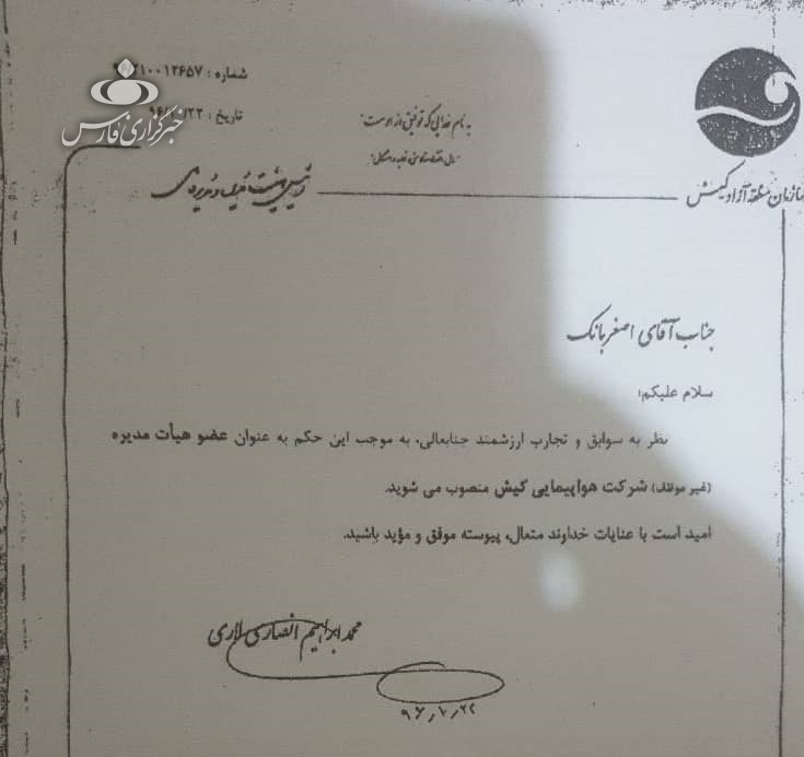 در عین حال، محمد ابراهیم انصاری لاری مدیرعامل سازمان منطقه آزاد کیش مورخ 22 دی ماه سال 96 برای اصغر بانک حکم عضو هیات مدیره غیرموظف در شرکت هواپیمایی کیش صادر کرد.
