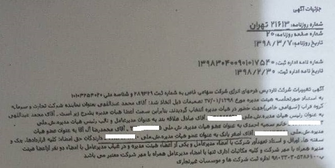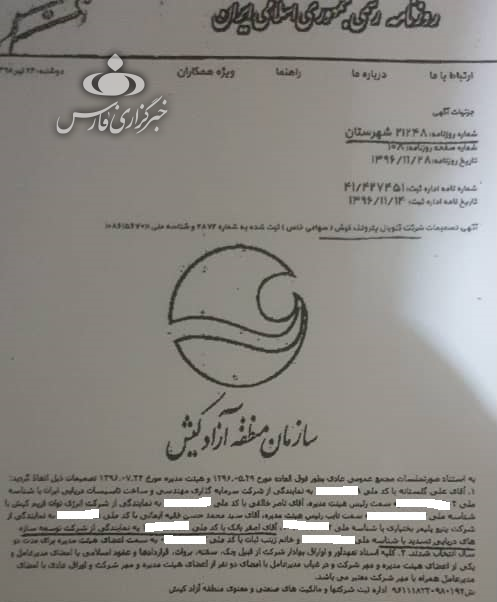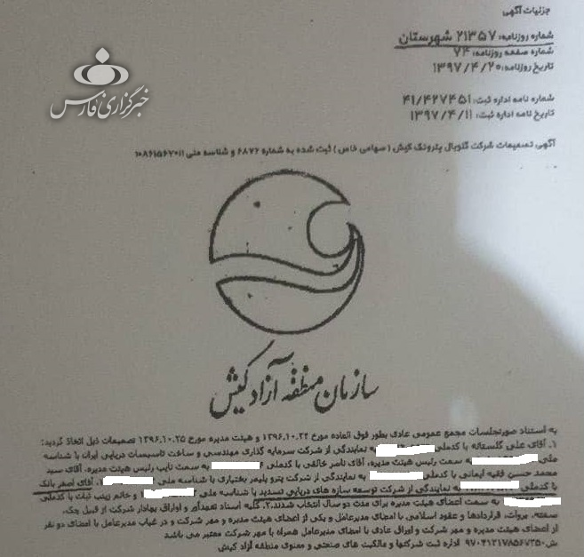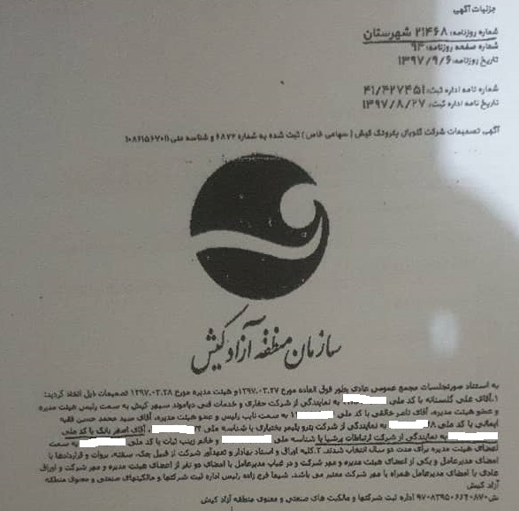 در همان ایام نامبرده به نمایندگی از شرکت توسعه سازههای دریایی تسدید در شرکت دیگری به نام شرکت گلوبال پتروتک کیش حضور یافته است.
