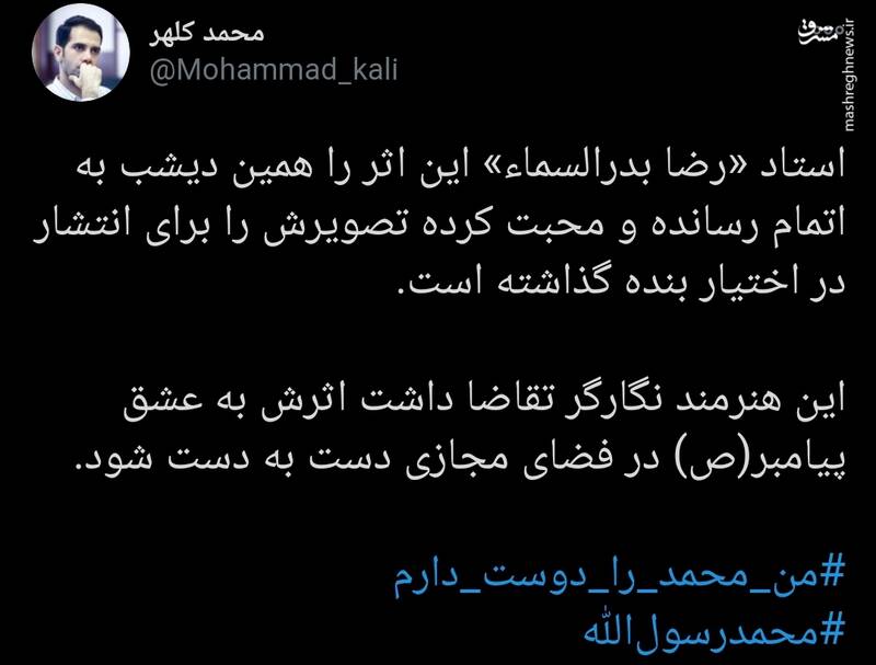 به گزارش مشرق، محمد کلهر، فعال رسانهای در توییتر نوشت: استاد «رضا بدرالسماء» این اثر را همین دیشب به اتمام رسانده و محبت کرده تصویرش را برای انتشار در اختیار بنده گذاشته است.