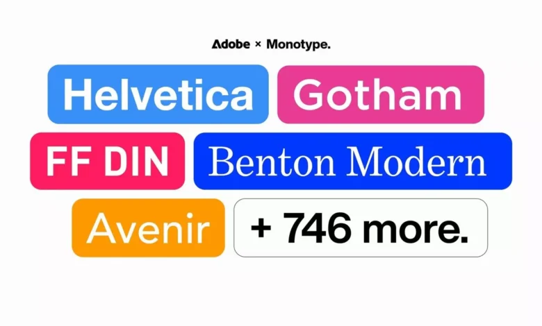بیش از ۷۵۰ فونت از میان ۱۵۰۰ عنوان جدید کتابخانه ادوبی با همکاری شرکت Monotype محقق شده است که مالکیت قانونی موارد محبوبی مثل Helvetica و Gotham را در اختیار دارد. البته نسخههای قدیمیتر برخی از این فونتها در سرویسهای ادوبی قرار داشتند؛ اما در اوایل سال ۲۰۲۳ شاهد حذف آنها از کتابخانه ادوبی بودیم.