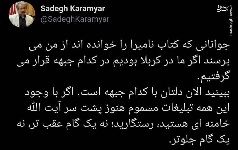 به گزارش مشرق، صادق کامیار، نویسنده در توییتر نوشت: جوانانی که کتاب نامیرا را خوانده اند از من می پرسند اگر ما در کربلا بودیم در کدام جبهه قرار می گرفتیم.