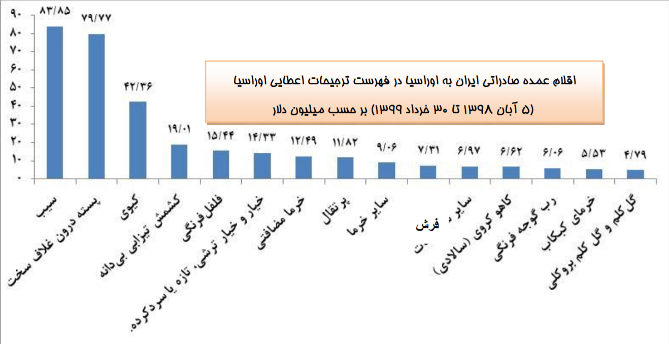 شکل 5 ) اقلام عمده صادراتی ایران به اوراسیا در فهرست ترجیحات اعطایی ایران بر حسب میلیون دلار
