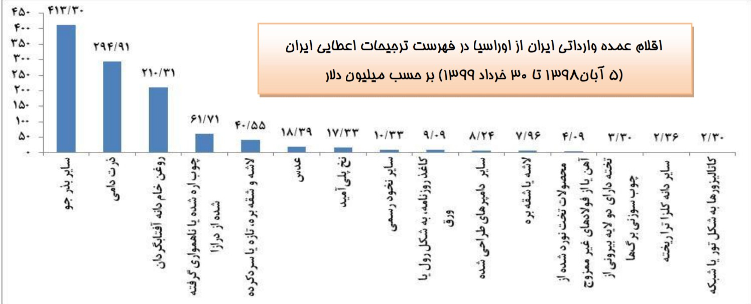 شکل 4 ) اقلام عمده وارداتی ایران از اوراسیا در فهرست ترجیحات اعطایی ایران بر حسب میلیون دلار