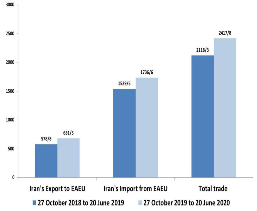 کل صادرات ایران به اوراسیا پس از اجرایی شدن موافقتنامه تا 30 خرداد 99 بالغ بر 681 میلیون دلار بوده که نسبت به دوره مشابه سال قبل 17 درصد رشد داشته است. کل واردات ایران از اوراسیا پس از اجرای موافقتنامه تا 30 خرداد 99 بالغ بر 1736 میلیون دلار بوده که نسبت به دوره مشابه سال قبل 13 درصد رشد داشته است.