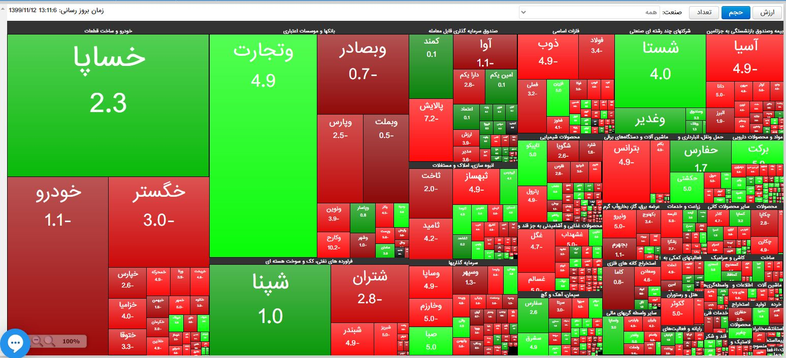 امروز نمادهای پر تراکنش در بورس شامل شستا، پالابش نفت اصفهان، سایپا، بانک تجارت، پالایش نفت تهران، ایران خودرو و گسترش سرمایهگذاری ایران خودرو بودند.