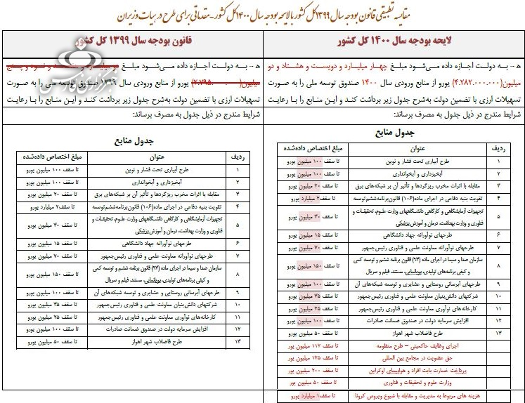 طبق بند ه تبصره 4 بودجه سال 1400 به دولت اجازه داده میشود، مبلغ چهار میلیارد و دویست و هشتاد و دو میلیون 4.282.000.000 یورو از منابع ورودی سال 1400 صندوق توسعه ملی را به صورت تسهیلات ارزی با تضمین دولت به شرح جدول زیر برداشت کند و این منابع را با رعایت دشرایط مندرج در ذیل جدول به مصرف برساند.