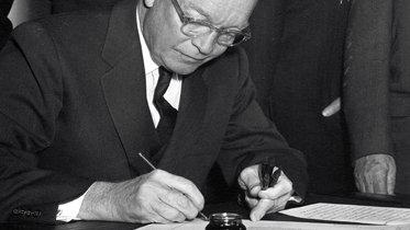 آیزنهاور در حال امضای قانون صادسام‌ها