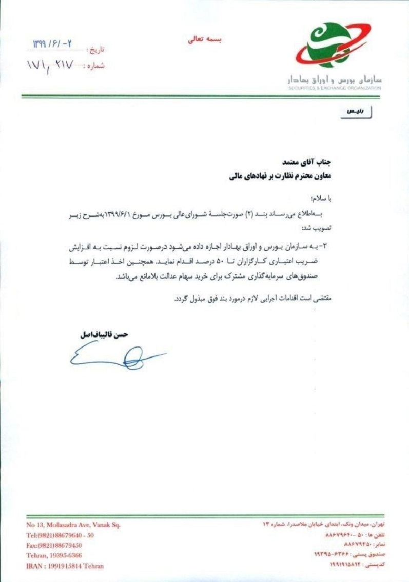 به گزارش خبرنگار اقتصادی خبرگزاری فارس، حسن قالیباف اصل رئیس سازمان بورس و اوراق بهادار تهران در نامهای به محمدرضا معتمد معاون نظارت بر نهادهای مالی این سازمان اعلام کرد: به اطلاع میرساند بند 2 صورتجلسه شورای عالی بورس مورخ اول شهریور 99 به شرح زیر تصویب شد.