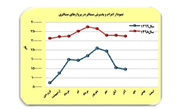 در ماه مورد مطالعه، اعزام و پذیرش مسافر نسبت به آذر 98 میزان 55 درصد کاهش داشته است.