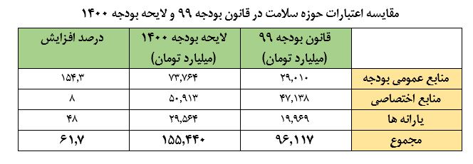 اعتبارات حوزه سلامت در لایحه بودجه 1400 به شدت افزایش یافته و به رقم 155 هزار میلیارد تومان رسیده است. تبعات شیوع کرونا بخصوص کاهش درآمدهای اختصاصی بیمارستانها، مهمترین دلیل این موضوع اعلام شده ولی بررسیهای صورت گرفته، صحت این ادعا را زیر سوال می برد.