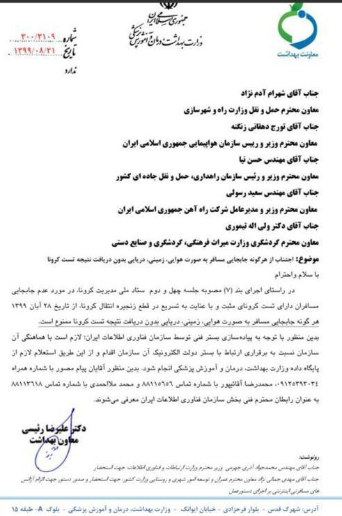 به گزارش خبرنگار اقتصادی خبرگزاری فارس، به تازگی معاون بهداشت وزیر بهداشت، درمان و آموزش پزشکی (علیرضا رئیسی) در نامهای خطاب به معاون حملونقل وزیر راه و شهرسازی، رئیس سازمان هواپیمایی کشوری، رئیس سازمان راهداری و حملونقل جادهای، مدیرعامل راهآهن و معاون گردشگری وزارت میراث فرهنگی، گردشگری و صنایع دستی با موضوع اجتناب از هرگونه جابهجایی مسافر، به صورت هوایی، زمینی و دریایی بدون دریافت تست کرونا اعلام کرده است: در راستای اجرای بند هفت مصوبه جلسه چهلودوم ستاد ملی مدیریت کرونا در مورد عدم جابهجایی مسافران دارای تست کرونای مثبت و با عنایت به تسریع در قطع زنجیره انتقال کرونا از تاریخ 28 آبان 99 هرگونه جابهجایی مسافر به صورت هوایی، زمینی و دریایی بدون دریافت تست کرونا ممنوع است.