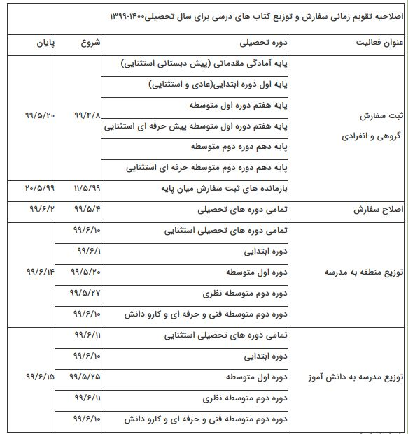 ثبتنام کتب درسی بر اساس اعلام سازمان پژوهش و برنامهریزی آموزشی و در مدت زمان مقرر شده در حال انجام است؛ البته با توجه به شروع زودهنگام سال تحصیلی، این زمان دستخوش تغییر هم شد. قرار بود ثبتنام کتابهای درسی آمادگی مقدماتی(پیشدبستانی استثنایی) و پایه اول دوره ابتدایی(عادی و استثنایی)، پایه هفتم دوه اول متوسطه، پایه هفتم دوره اول متوسطه پیشحرفهای استثنایی، پایه دهم دوره دوم متوسطه و پایه دهم دوره دوم متوسطه حرفهای استثنایی که هشتم تیر آغاز شد، 20 مرداد پایان یابد اما در مرحله اول تا 31 مرداد و در مرحله دوم تا 10 شهریور تمدید شد.