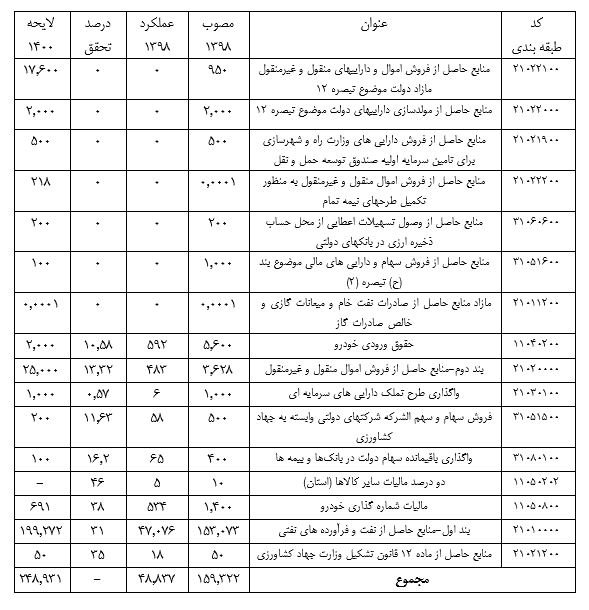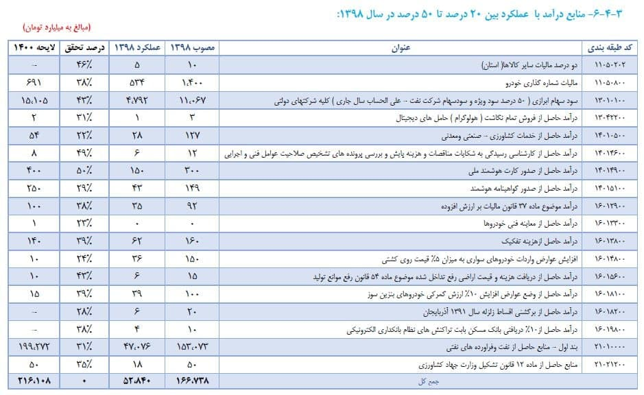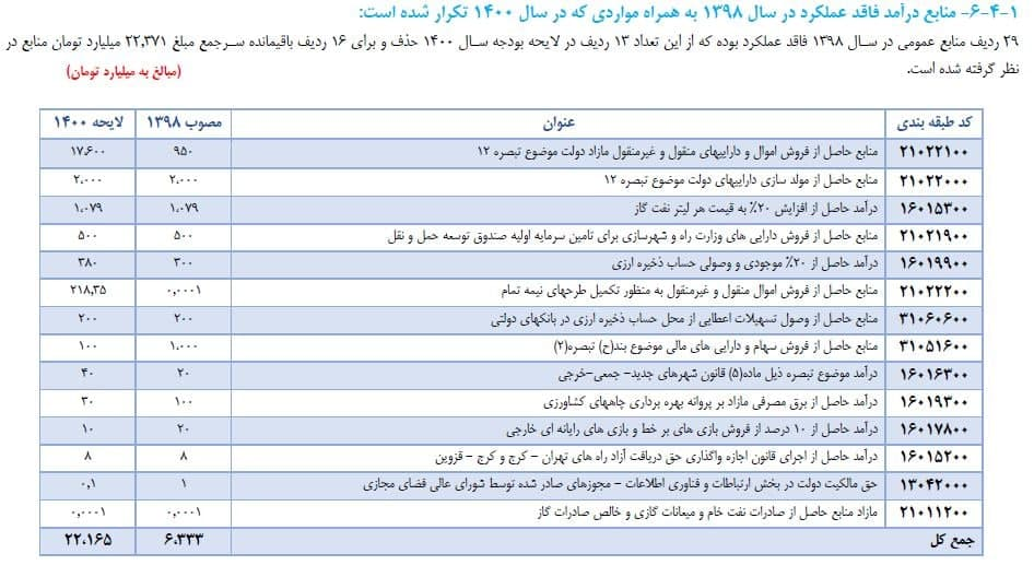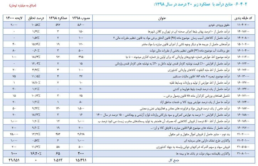 براساس این گزارش، 18 ردیف منابع عمومی در سال 1398 عملکردی بین 20 تا 50 درصد داشته اند که برای این ردیفها در لایحه بودجه سال 1400 مجموعا مبلغ 216 هزار و 108 میلیارد تومان منابع در این لایحه نظر گرفته شده است. میزان منابع پیش بینی شده از محل این 18 ردیف در قانون بودجه 98، 166 هزار و 738 میلیارد تومان بوده و صرفا 52 هزار و 840 میلیارد تومان یعنی کمتر از یک سوم درآمدهای مصوب از این محل در سال مذکور محقق شده است.