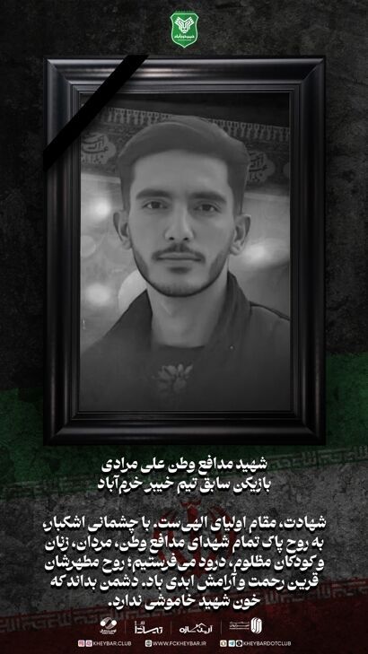 باشگاه خیبر خرمآباد با انتشار پیامی ضمن تسلیت به خانواده مرادی نوشت: شهادت، مقام اولیای الهیست. با چشمانی اشکبار، به روح پاک تمام شهدای مدافع وطن، مردان، زنان و کودکان مظلوم، درود میفرستیم؛ روح مطهرشان قرین رحمت و آرامش ابدی باد. دشمن بداند که خون شهید خاموشی ندارد.