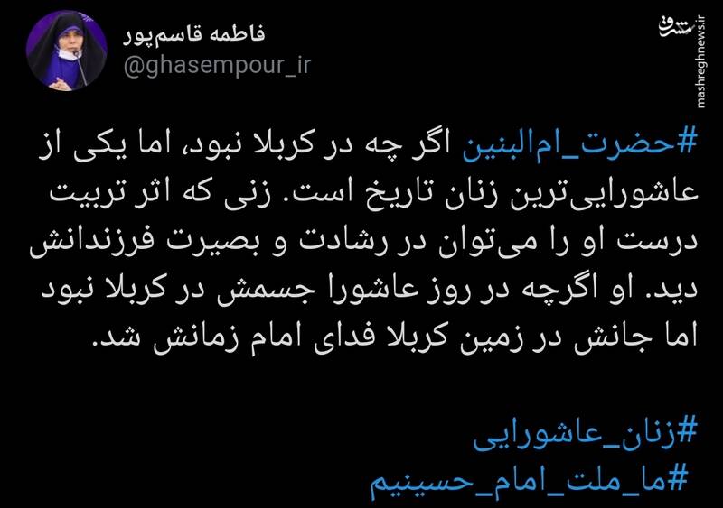 به گزارش مشرق، فاطمه قاسمپور، نماینده مجلس شورای اسلامی در توییتر نوشت: حضرت امالبنین اگر چه در کربلا نبود، اما یکی از عاشوراییترین زنان تاریخ است. زنی که اثر تربیت درست او را میتوان در رشادت و بصیرت فرزندانش دید. اگرچه در روز عاشورا جسمش در کربلا نبود اما جانش در زمین کربلا فدای امام زمانش شد.