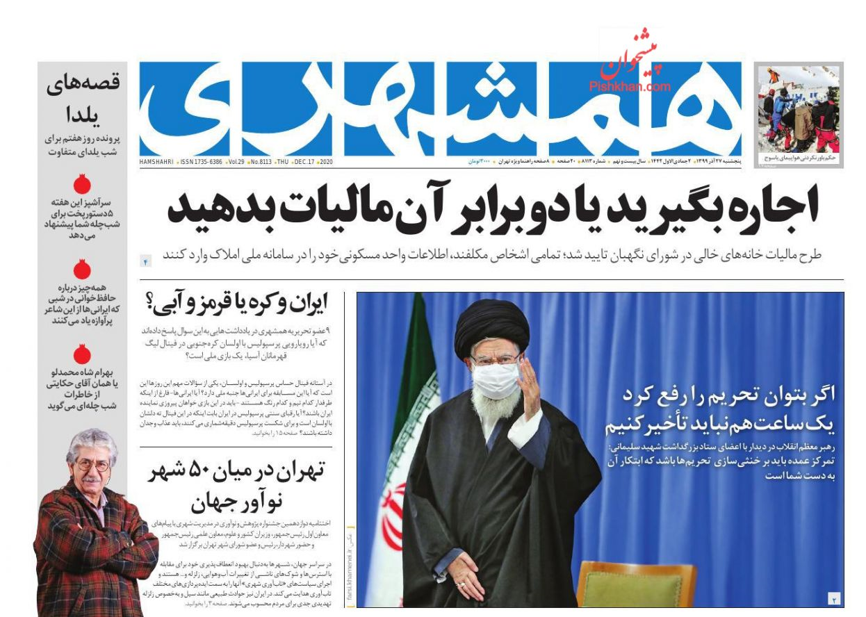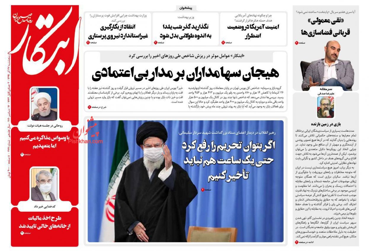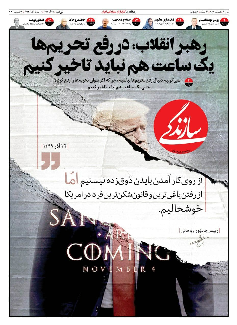 گروه سیاسی خبرگزاری فارس: روزنامههایی که روز ۲۷ دیماه ۱۳۹۴ با تیتر «صبح بدون تحریم»، «فروپاشی تحریم» و «تحریمها رفت» به استقبال اجرای برجام رفتند، روز گذشته با تیتر «یک ساعت هم نباید در رفع تحریمها تأخیر کرد» به استقبال سخنان چهارشنبه رهبر معظّم انقلاب در دیدار دستاندرکاران بزرگداشت سالگرد حاج قاسم سلیمانی رفتند.