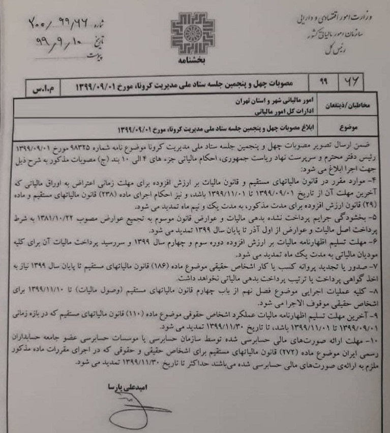 در این نامه آمده است: مصوبات چهل و پنجمین جلسه ستاد ملی مدیریت کرونا موضوع نامه شماره ۹۸۳۲۵ مورخ ۱۳۹۹/۰۹/۰۱ رئیس دفتر محترم و سرپرست نهاد ریاست جمهوری، احکام مالیاتی جزء های ۲ الی ۱۰ بند (ج) مصوبات مذکور به شرح ذیل جهت اجرا ابلاغ می شود: