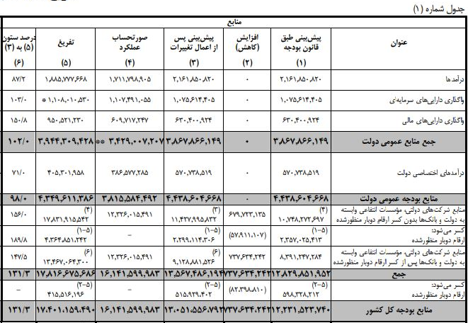 منابع تحقق یافته شرکتهای دولتی، بانکها و مؤسسات انتفاعی وابسته به دولت پس از کسر ارقام دوبار منظور شده، بالغ بر سیزده میلیون و چهارصد و شصت و هفت هزار و شصت و چهار میلیارد و سیصد میلیون ۱۳٫۴۶۷,۰۶۴٫۳۰۰,۰۰۰,۰۰۰ ریال حدود ۱۴۸٪ پیش بینی منابع شرکتهای دولتی، بانکها و مؤسسات انتفاعی وابسته به دولت پس از اعمال تغییرات میباشد.
