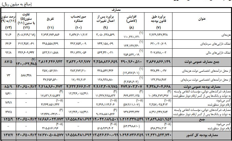 بر اساس نتایج حاصل از تفریغ بودجه، مبالغ پرداختی بابت مصارف عمومی دولت که شامل مانده وجوه مصرف نشده انتقال یافته به سال ۱۳۹۸ نیز می باشد، بالغ بر سه میلیون و هشتصد و چهارده هزار و دویست و چهل و شش میلیارد و نهصد و چهل و سه میلیون ۳،۸۱۴٫۲۴۶,۹۴۳,۰۰۰,۰۰۰ ریال حدود ۸۸٪ برآورد مصارف عمومی دولت پس از اعمال تغییرات و همچنین مصارف انجام شده از محل درآمدهای اختصاصی بالغ بر چهارصد و چهار هزار و هفتصد و سیزده میلیارد و پانصد و سی میلیون ۴۰۴٫۷۱۳,۵۳۰,۰۰۰,۰۰۰ ریال حدود ۸۴٪ برآورد مصارف اختصاصی پس از اعمال تغییرات می باشد.