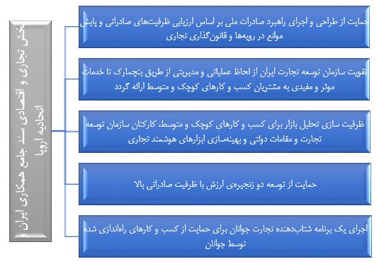 در این سند جامع، به مسائل تجاری و اقتصادی، محیط زیست و مسائل اجتماعی پرداخته شده و اقداماتی در راستای شکل دهی تجارت ایران تعیین شده است. این اقدامات شامل موارد زیر است: