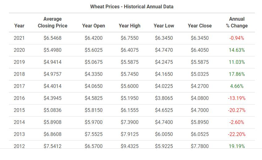 قیمت گندم در سال 2019 به میزان 11.03 درصد و در سال 2018 به میزان 17.86 درصد و سال 2017 به میزان 1.63 درصد رشد قیمت داشته است.