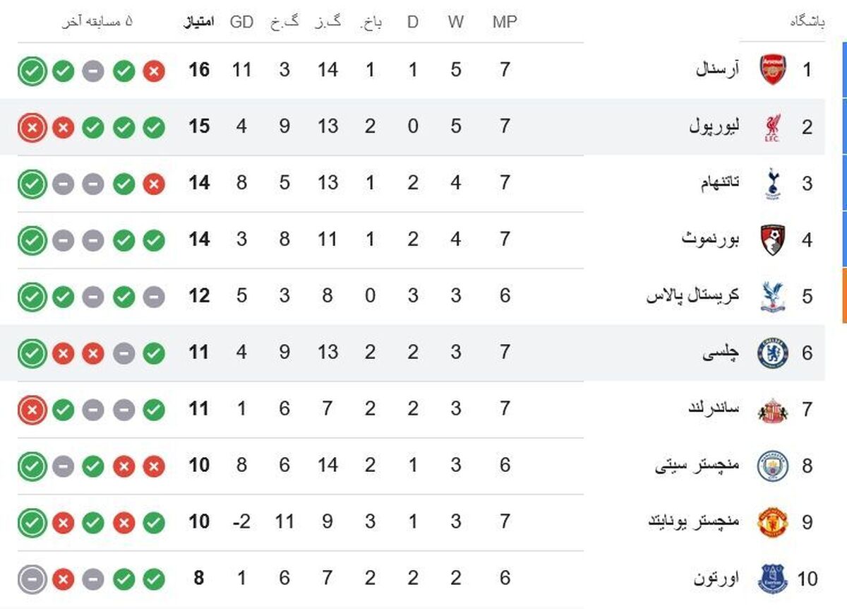 صدرنشینی آرسنال: آرسنال با پیروزی ۲-۰ مقابل وستهم، به صدر جدول لیگ برتر رسید و با ۱۶ امتیاز در جایگاه اول قرار گرفت.