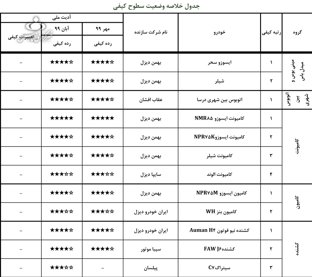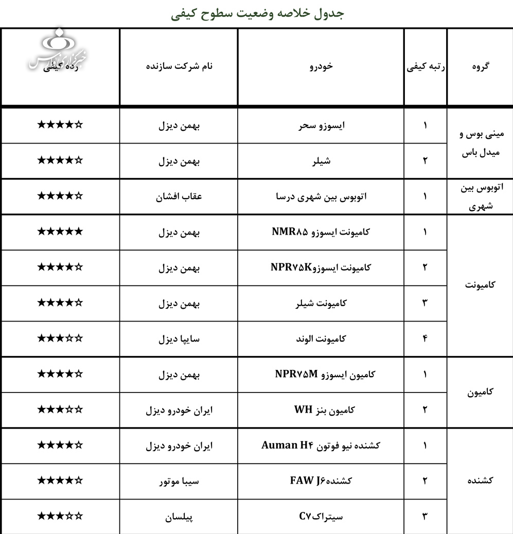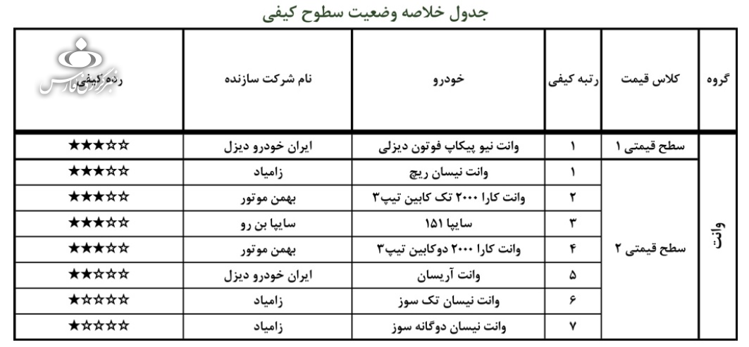 جدول سطوح کیفی خودروهای گروه سبک-بخش وانت