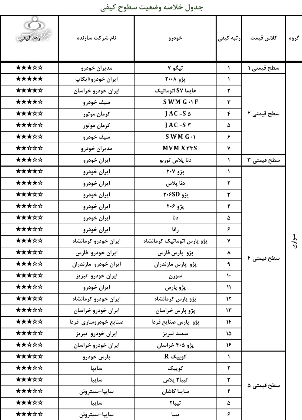 جدول سطوح کیفی خودروهای گروه سبک-بخش سواری
