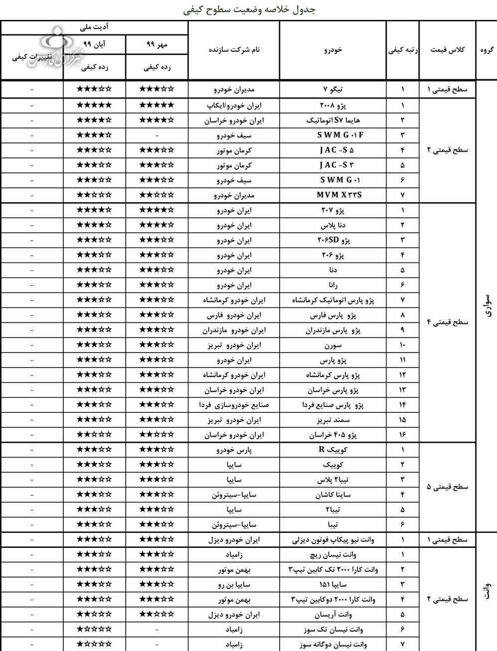 گزارش ارزشیابی کیفی خودروها در آبان ماه منتشر شد. بر این اساس اکثر خودروهای پرتیراژ دارای 3 ستاره کیفی از 5 ستاره هستند.