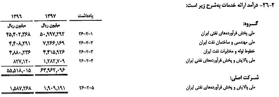 براساس صورت مالی شرکت ملی پالایش و پخش فرآورده های نفتی ایران در سال 1397، بخشی از درآمدهای عملیاتی این شرکت، درآمدهای ناشی از ارائه خدمات است.