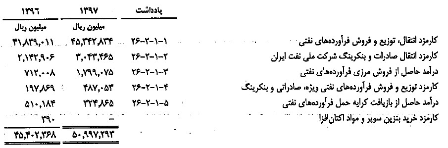 براساس اطلاعات مندرج در گزارش صورت مالی شرکت ملی پالایش و پخش فرآورده های نفتی ایران، نرخ کارمزد انتقال، توزیع و فروش فرآورده های نفتی براساس جدول موضوع ماده (12) آئین نامه اجرایی بند «ح» ماده (1) قانون الحاق برخی مواد به قانون بخشی از مقررات مالی دولت (2) و به استناد مجموع درآمد ارائه خدمات در بودجه اصلاحی شرکت ملی پخش فرآورده های نفتی ابلاغی از سازمان برنامه و بودجه شناسایی گردیده است.