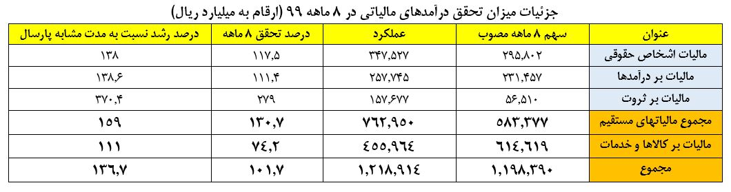 جزئیات درآمد 8 ماهه مالیات در بخش‌های مختلف نشان می‌دهد که درآمد ناشی از مالیات بر ثروت 279 درصد تحقق یافته است.