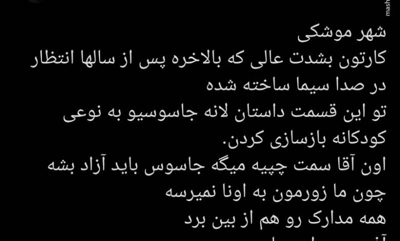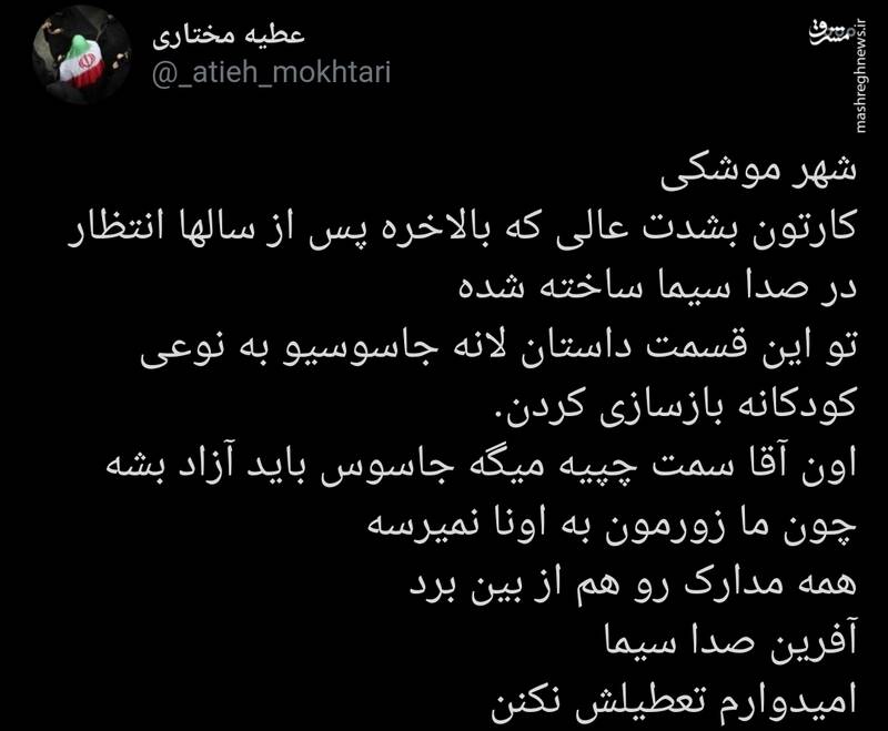 به گزارش مشرق، یک کاربر فضای مجازی درباره کارتون شهر موشکی طی توییتی نوشت: کارتون بشدت عالی که بالاخره پس از سالها انتظار در صدا سیما ساخته شده