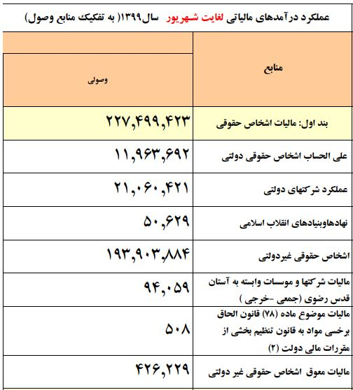 عملکرد شرکتهای دولتی به نحوی بوده که در این مدت 2100 میلیارد تومان مالیات پرداخت و 1196 میلیارد تومان نیز از اشخاص حقوقی دولت به صورت علیالحساب درآمد دریافت شد.