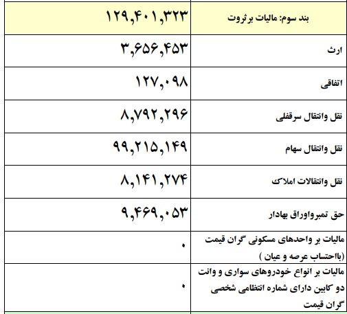 سومین بخش مالیات بر ثروت است که در شش ماهه امسال 12 هزار 940 میلیارد تومانی درآمد برای دولت داشته است.