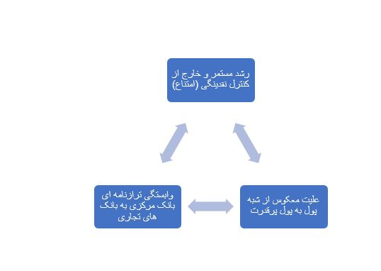 چالش مرسوم سیاست گذار در مساله خلق پول٬ کنترل خلق «پول» و «شبه پول»[10] و استقلال بانک مرکزی از دولت است٬ حال بیایم این وضعیت را در اقتصاد ایران ببینیم. اول به دلیل افسارگسیختگی نظام بانکی به خصوص شبکه بانکداری خصوصی و موسسات پولی و اعتباری رابطه علیت از پول به نقدینگی معکوس شده است. یعنی اگرچه در نظام بانکی مرسوم ابتدا پول پرقدرت خلق شده و سپس نسبتی از آن از طریق فرایند وامدهی بانکها به شبه پول و نقدینگی دامن می زند٬ در ایران به دلیل وابستگی شدید ترازنامه ای بانک مرکزی به بانک های تجاری٬ وامدهی بانکها مستقلا منجر به رشد منابع پایه پولی بانک مرکزی و در نهایت رشد پول پرقدرت میشود. دوم معنای مصطلح استقلال بانک مرکزی در مقابل دولت و وابستگی به آن است که در ایران اتفاقا باید از وابستگی بانک مرکزی به بانکهای تجاری صحبت کرد. از ابتدای دهه ۸۰ خورشیدی و رشد قارچ گونه شبکه بانکداری خصوصی به این طرف بانک مرکزی دیگر جایگاه سیاست گذاری پولی خود را از دست داده است که می توان همین دو مورد را دلایل اصلی دانست. حق ناشر[11] که روزی به بانک های مرکزی تعلق داشت اکنون در یدٍ بانکهای تجاری است و آنها هستند که براساس منافع کوتاه مدت خود ضرباتی بر پیکر بی جان اقتصاد ایران می زنند که سالیان سال تاثیر خود را خواهد گذاشت.
