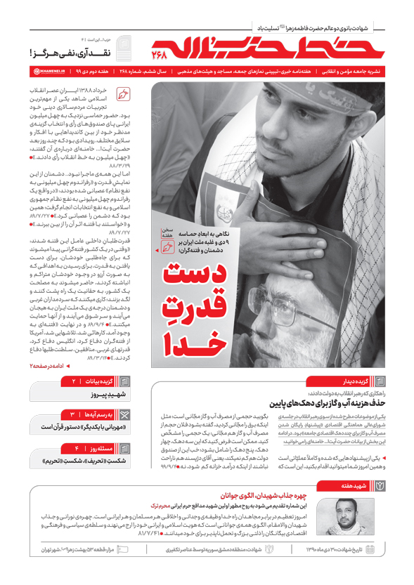 نشریهی خط حزبالله، در سخن هفتهی این شماره نگاهی به ابعاد حماسهی ملت ایران در ۹دی ۸۸ و غلبهی مردم بر دشمنان و فتنهگران داشته است.