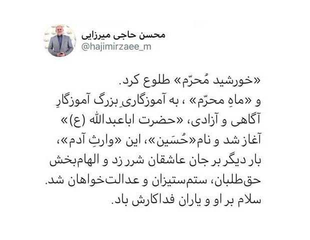 به گزارش خبرنگار آموزش و پرورش خبرگزاری فارس، محسن حاجیمیرزایی وزیر آموزش و پرورش در صفحه شخصی خود در توئیتر اظهار کرد: «خورشید مُحرّم» طلوع کرد و «ماهِ محرّم» به آموزگاریِ بزرگ آموزگارِ آگاهی و آزادی، «حضرت اباعبدالله (ع)» آغاز شد.