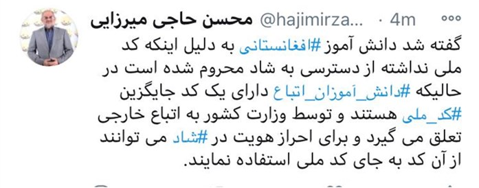وی نوشت: گفته شد دانشآموز افغانستانی به دلیل اینکه کد ملی نداشته از دسترسی به شاد محروم شده است در حالی که دانشآموزان اتباع دارای یک کد جایگزین کد ملی هستند و توسط وزارت کشور به اتباع خارجی تعلق میگیرد و برای احراز هویت در شاد میتوانند از آن کد به کد ملی استفاده نمایند.