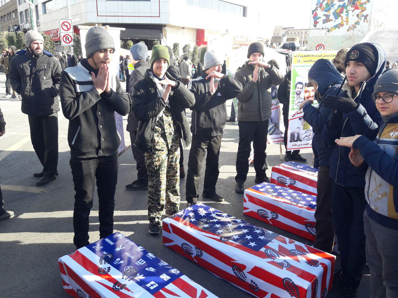 راهپیمایی ۲۲ بهمن در تهران همزمان با سراسر کشور در حالی آغاز شد که تعدادی از شرکتکنندگان تابوتهایی نمادین از سربازان ارتش تروریستی آمریکا را به جمع تهرانیها آوردهاند.