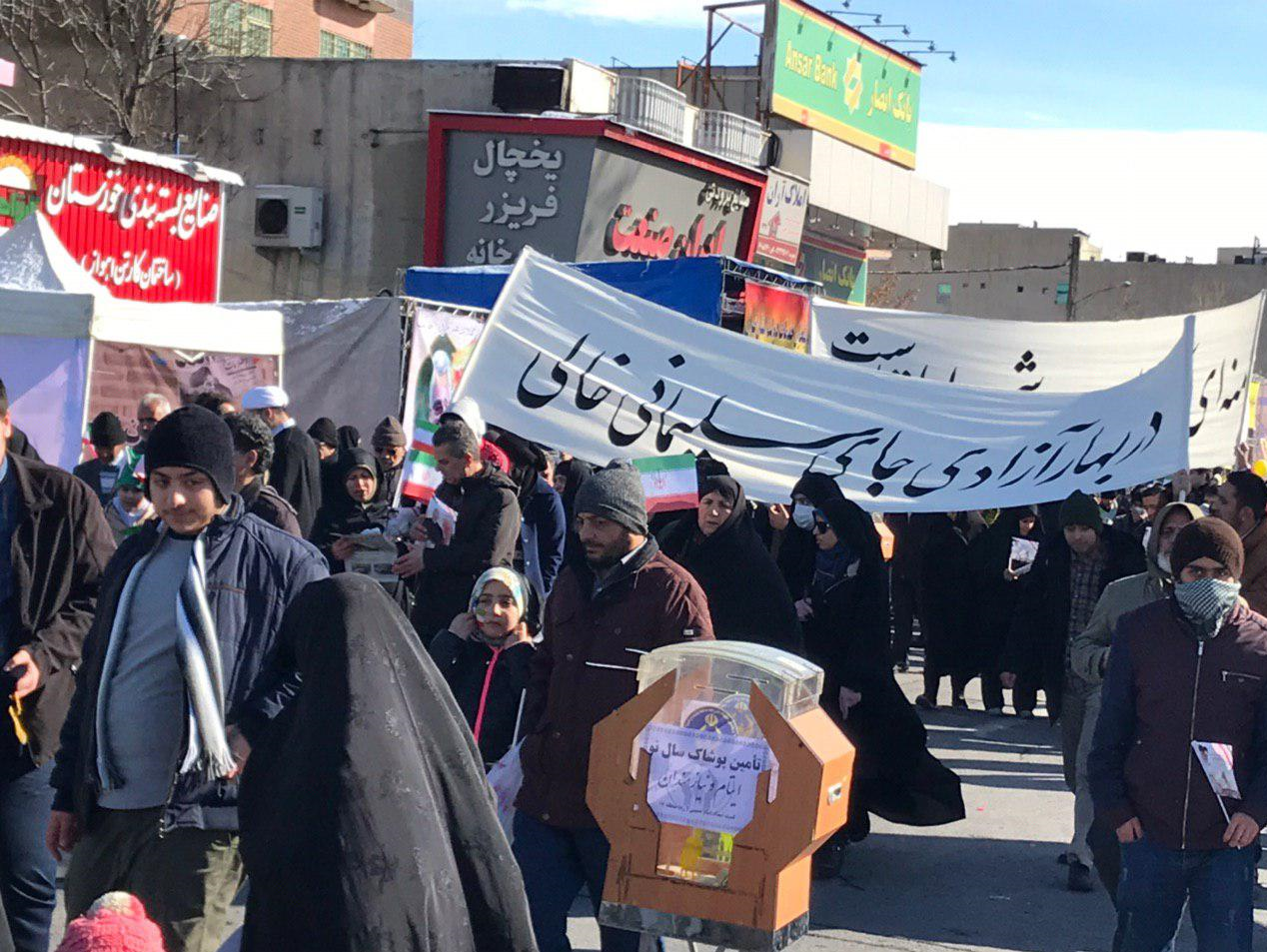 برخی از شرکت کنندگان در راهپیمایی ۲۲ بهمن با در دست داشتن پارچه نوشتههایی با عنوان «در بهار آزادی جای سلیمانی خالی» یاد سردار سپهبد شهید حاج قاسم سلیمانی را گرامی داشتند.