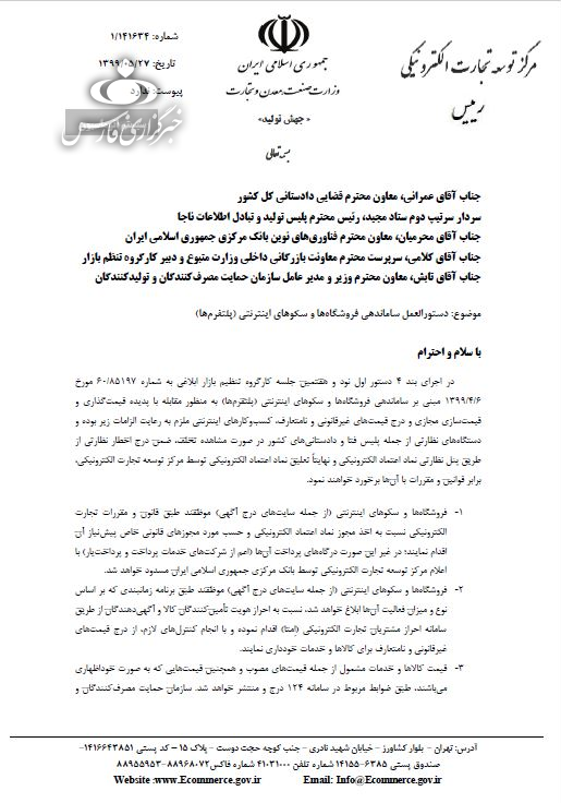 در اجرای بند ۴ دستور اول نود و هفتمین جلسه کارگروه تنظیم بازار ابلاغی به شماره ۶۰.۸۵۱۹۷ مورخ 1399.4.6 مبنی بر ساماندهی فروشگاه ها و سکوهای اینترنتی (پلتفرم ها) به منظور مقابله با پدیده قیمت گذاری و قیمت سازی مجازی و درج قیمت های غیرقانونی و نامتعارف، کسب و کارهای اینترنتی ملزم به رعایت الزامات زیر بوده و دستگاه های نظارتی از جمله پلیس فتا و دادستانی های کشور در صورت مشاهده تخلف، ضمن درج اخطار نظارتی از طریق پنل نظارتی نماد اعتماد الکترونیکی و نهایتا تعلیق نماد اعتماد الکترونیکی توسط مرکز توسعه تجارت الکترونیکی، برابر قوانین و مقررات با آنها برخورد خواهند نمود.