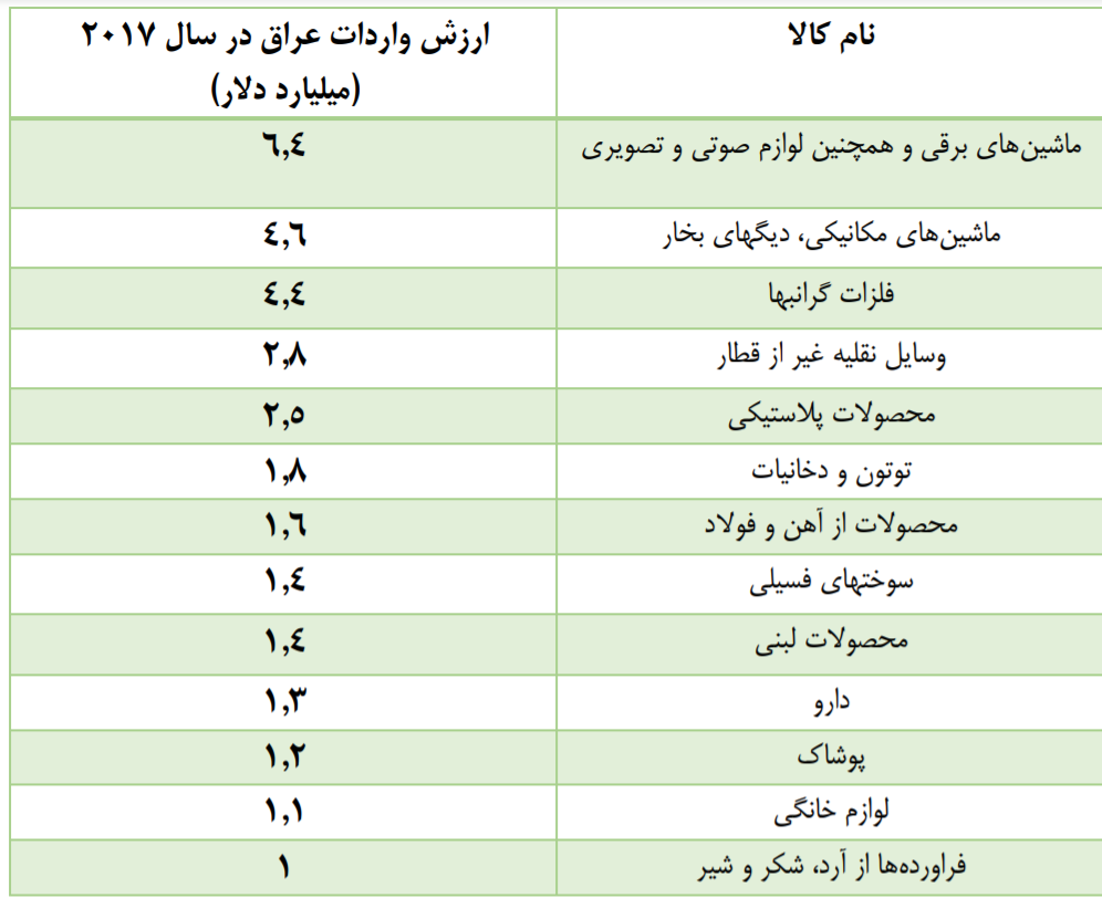 واردات ۵۰ میلیارد دلار کالا توسط عراق در کنار ۲ میلیارد دلار صادرات غیر نفتی این کشور سبب شده است که بسیاری از