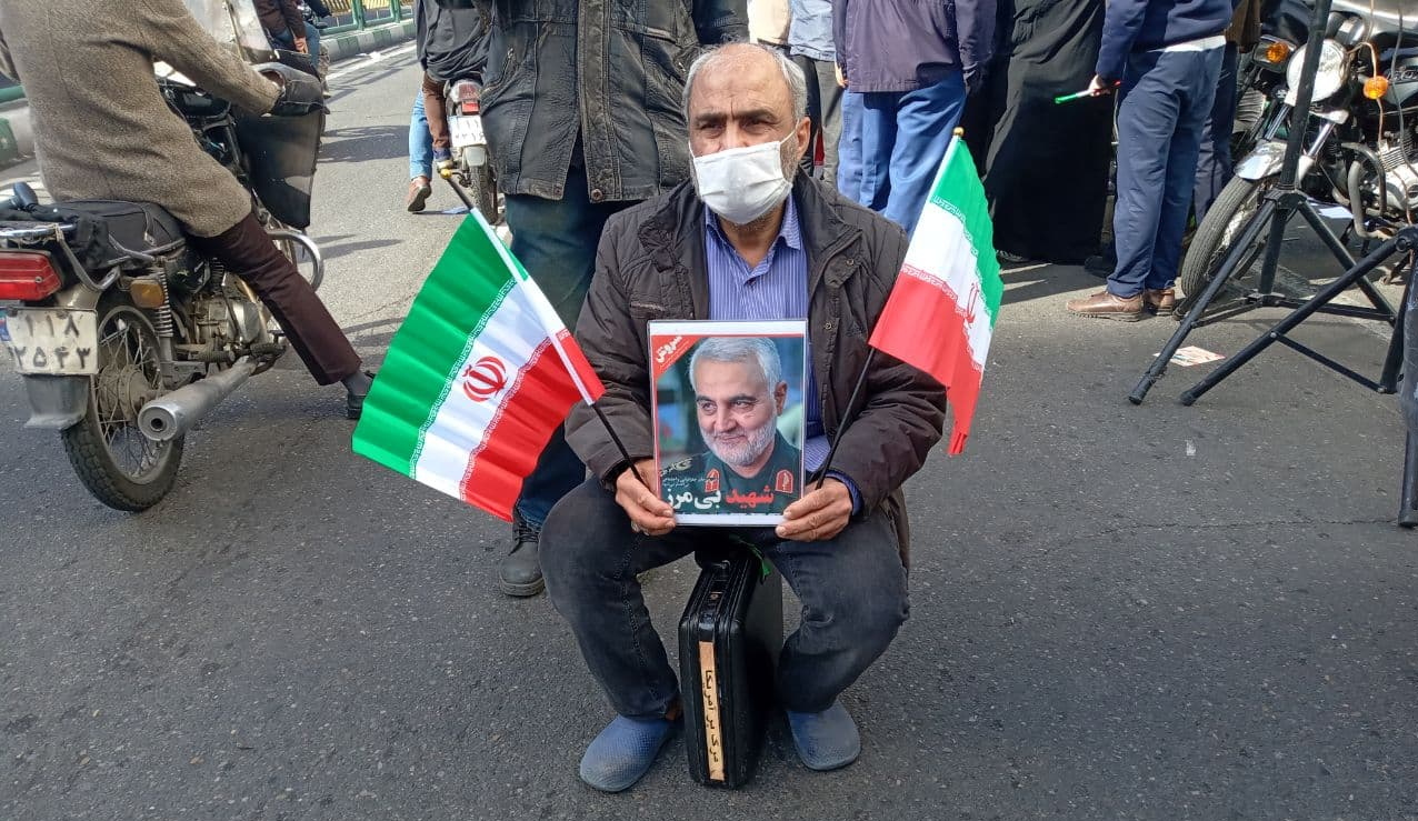 تمثال شهید سردار سپهبد قاسم سلیمانی بر دستان راهپیمایی کنندگان تهرانی قرار دارد؛ برخی از راهپیمایی کنندگان، با شعار قاسم هنوز زنده است پایبندی خود به مسیر سردار شهید خود را فریاد می زنند.