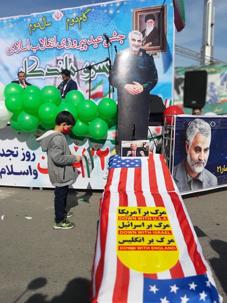 تابوت دونالد ترامپ رییس جمهور آمریکا در مسیر راهپیمایی یوم الله ۲۲ بهمن وجود دارد و شعار قطعی انتقام حتمی است با پلاکاردهایی در دست مردم قرار دارد.