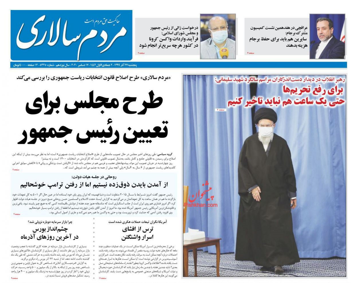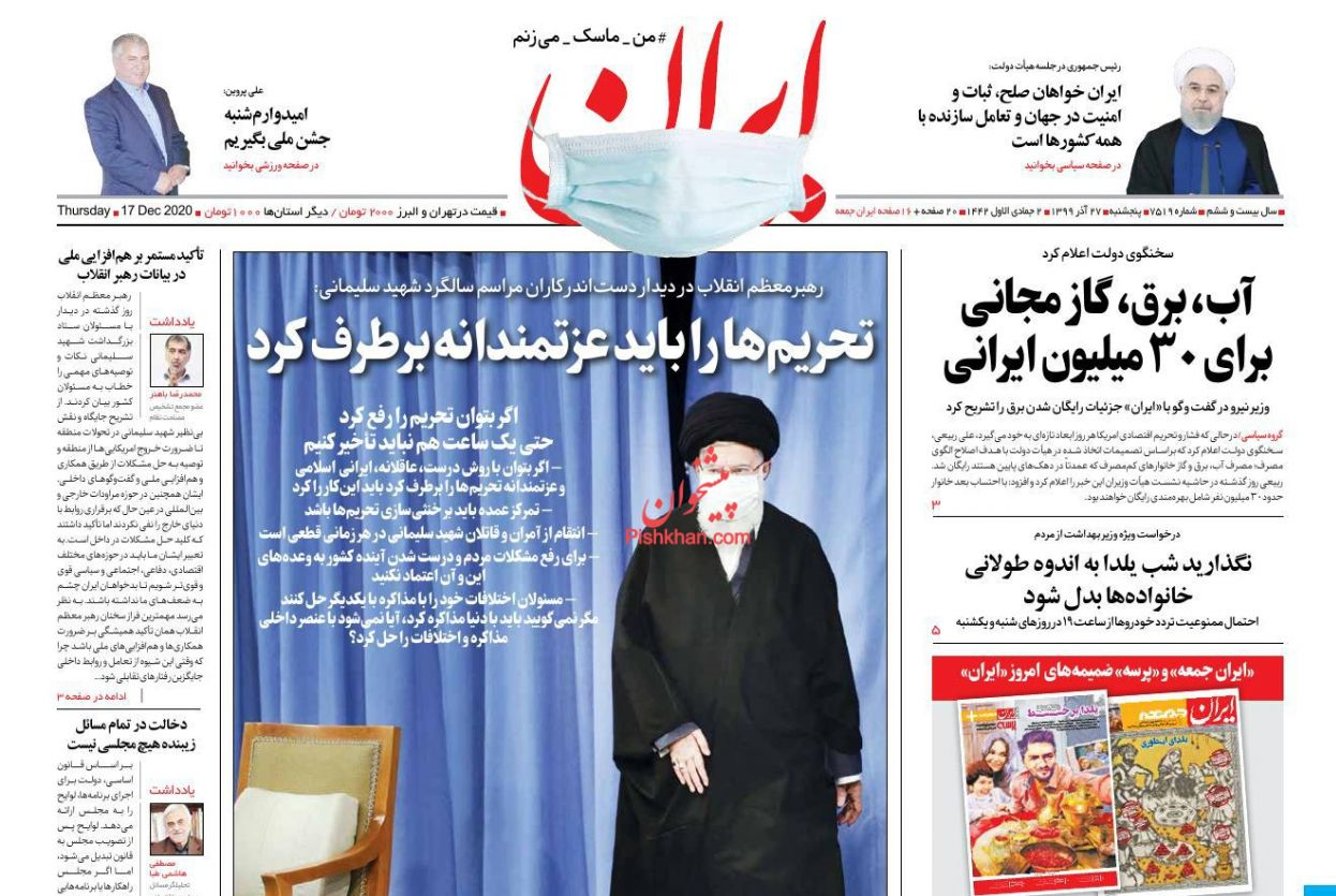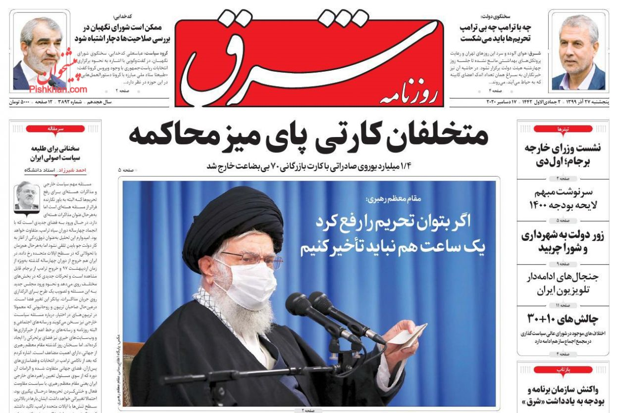 گروه سیاسی خبرگزاری فارس: روزنامههایی که روز ۲۷ دیماه ۱۳۹۴ با تیتر «صبح بدون تحریم»، «فروپاشی تحریم» و «تحریمها رفت» به استقبال اجرای برجام رفتند، روز گذشته با تیتر «یک ساعت هم نباید در رفع تحریمها تأخیر کرد» به استقبال سخنان چهارشنبه رهبر معظّم انقلاب در دیدار دستاندرکاران بزرگداشت سالگرد حاج قاسم سلیمانی رفتند.