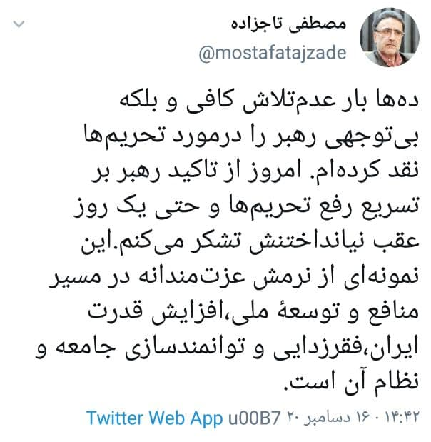تاجزاده از چهرههای تندروی اصلاحات که سابقه حمایت از بیانات رهبر انقلاب را ندارد، با تکیه بر جمله فرعی رهبر انقلاب، از آن استقبال کرد. حال که آنچه او و همفکرانش از سخنان رهبر انقلاب بهدست آوردهاند، کلید رفع تحریمها نیست،بلکه توپی است که در زمین جناح سازشکار و غربگرا افتاده است.